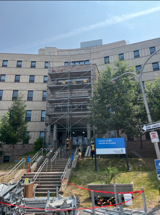 La fermeture provisoire de l'entrée principale du pavillon de la Faculté de musique est envisagée pour effectuer le démontage de la toiture temporaire (voir la photo plus bas);
