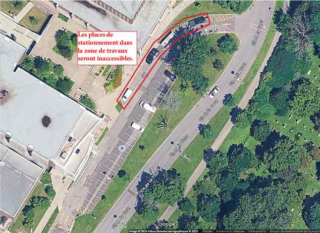 Dans le cadre de travaux en hauteur réalisés du côté du stationnement sur le chemin de la Tour, les places de stationnement situées le long du trottoir (voir l'image ci-dessous) seront inaccessibles;