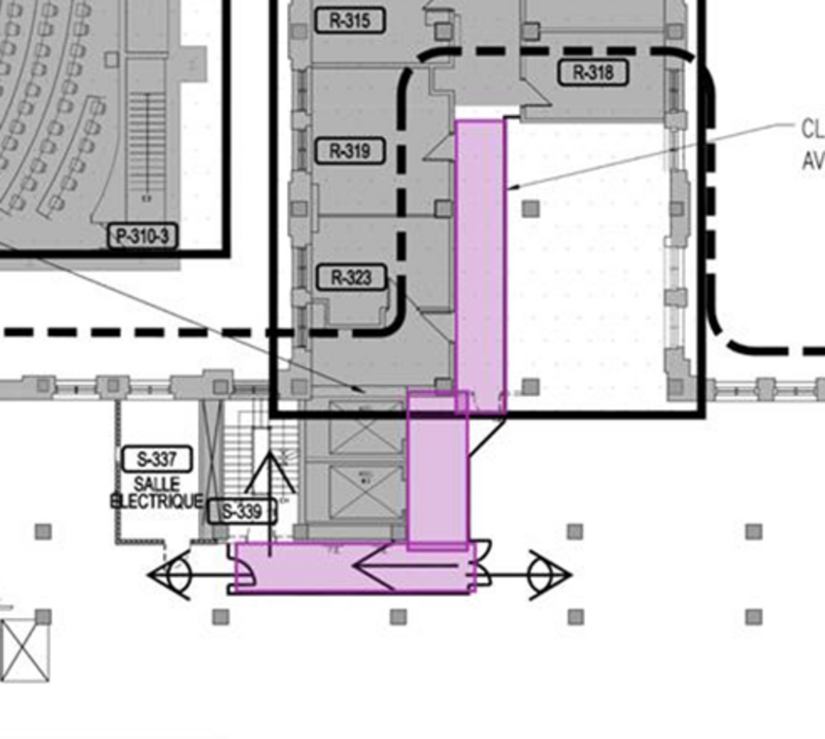 - Travaux de démantèlement du plafond suspendu dans le S3/R3, afin de poursuive les travaux de reconstruction (en mauve sur le plan).