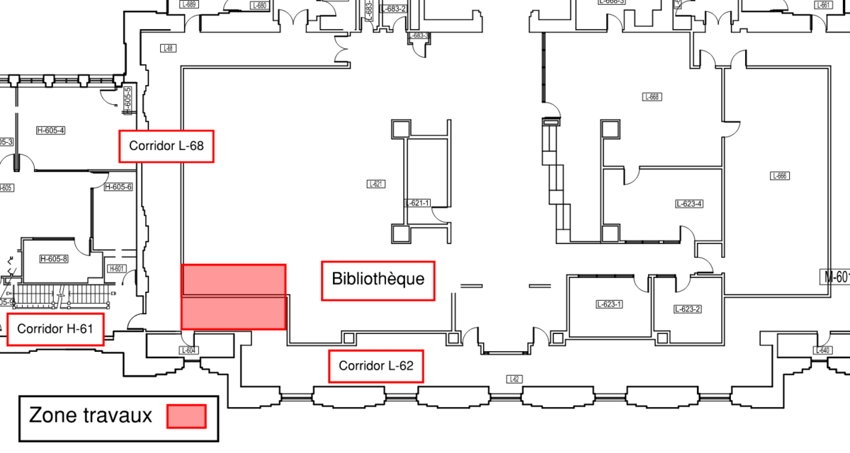 - Le passage dans les corridors L-62 et L-68 sera partiellement obstrué mais la circulation du public restera possible.