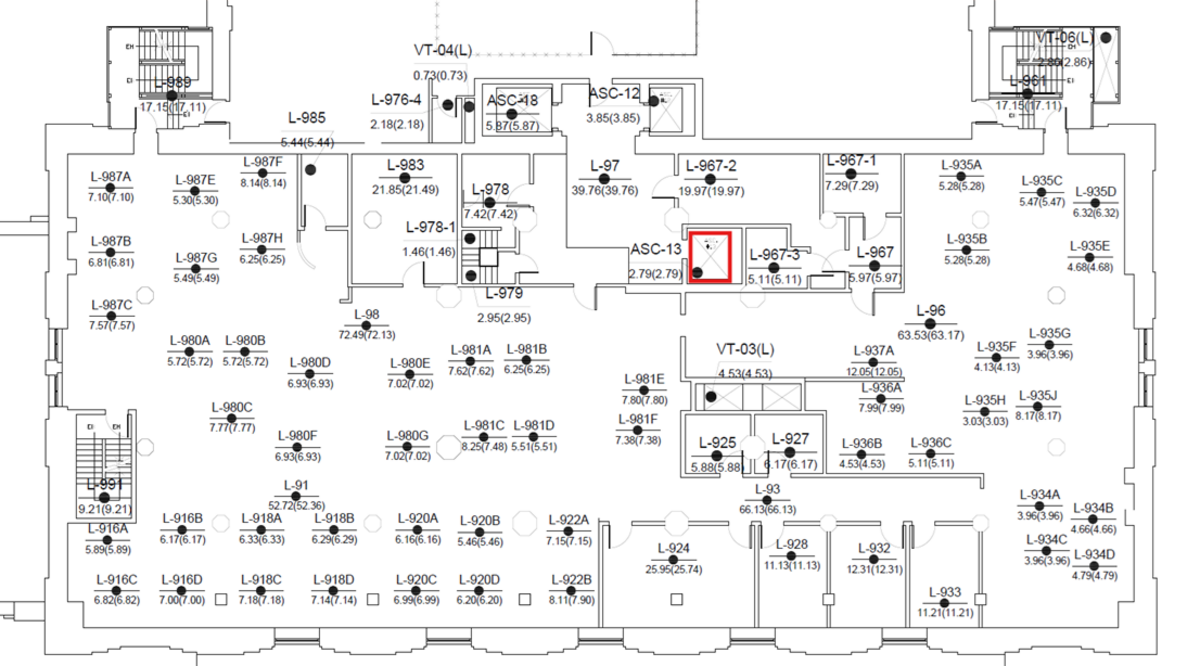 • L-9 : l’accès à l’ascenseur 13 sera interdit pendant la durée des travaux (voir localisation de l’ascenseur 13 sur le plan ci-dessous)