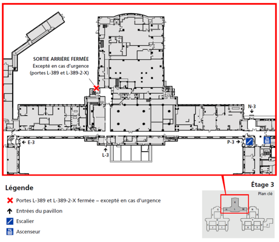 Le passage des piétons et l'accès par les portes L-389 et L-389-2-x seront interdits pendant la durée des travaux, sauf en cas d'évacuation d'urgence;