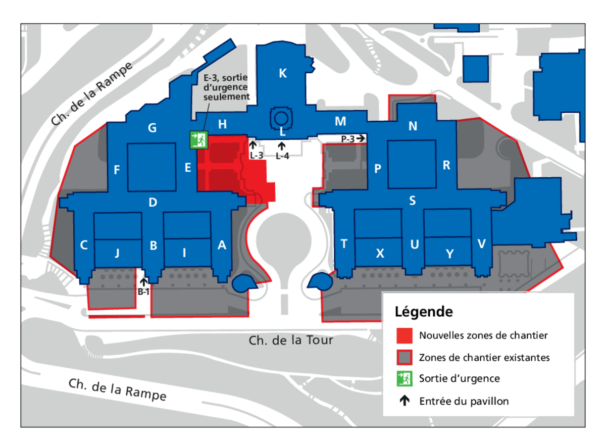 - Circulation par la porte E-301-X uniquement en cas d’évacuation d’urgence pendant la durée des travaux. Pour la circulation quotidienne, les usagers doivent se diriger vers les portes des secteurs L et M.