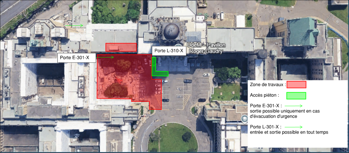 - Pendant la durée des travaux, la circulation par la porte E-301-X se fera uniquement en cas d’évacuation d’urgence.