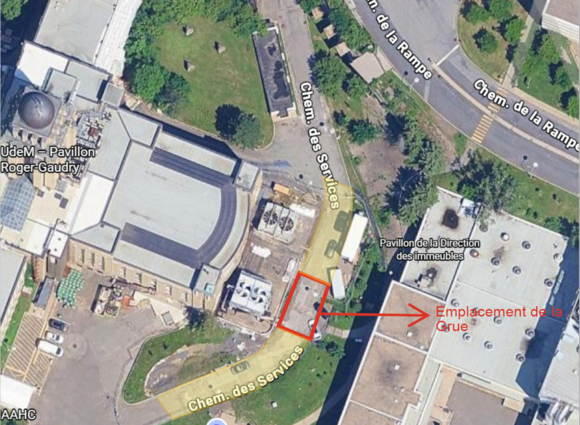 La mobilisation temporaire d'une grue sur une portion de la voie du chemin des Services sera nécessaire pour réaliser les travaux (voir le plan plus bas).