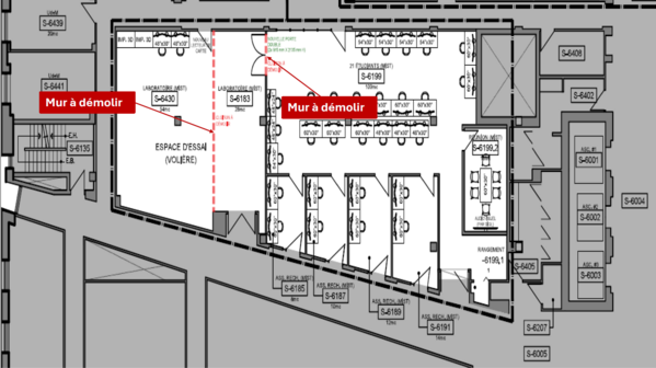 En vue de rénover des locaux au 6e étage du pavillon André-Aisenstadt, il est prévu dans la phase 1, des travaux de démolition de murs dans certains locaux (6183, 6199 et 6430) du secteur B (voir le plan plus bas);