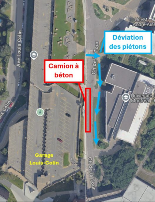 Les travaux nécessiteront l'utilisation d'une ligne pompe et d'un camion de béton sur la voie du chemin de la Tour (voir le schéma plus bas).