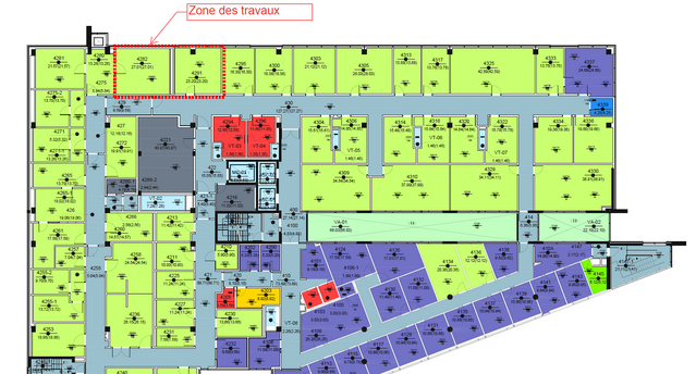 Le bruit pourrait impacter tout le pavillon, en particulier les usagers des locaux situés à proximité de la zone des travaux aux 3e, 4e et 5e étages (voir le plan ci-dessous).