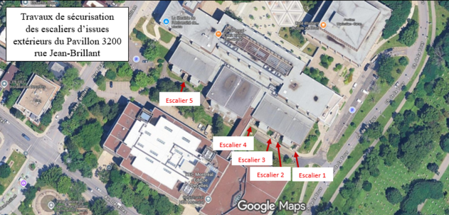 - Il est prévu d'effectuer des travaux de sécurisation des escaliers d'issue (1 à 5) donnant accès à l'extérieur du pavillon 3200, rue Jean-Brillant (voir la photo plus bas).