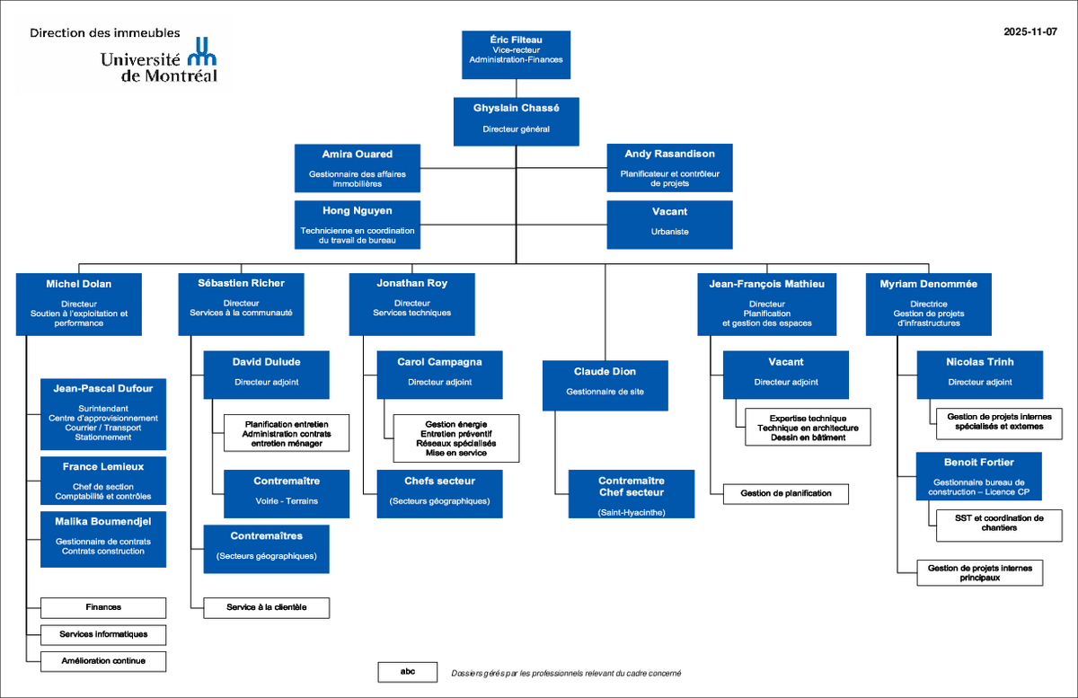 Avec ses six divisions, elle combine l'expertise et le savoir-faire de près de 300 membres du personnel pour entretenir les immeubles et les terrains des quatre campus de l'Université : le campus de la montagne, le campus MIL, le campus de l’UdeM à Laval et le campus de Saint-Hyacinthe.